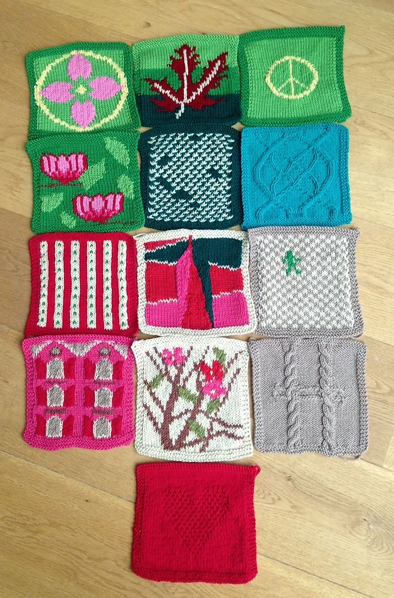 Last year I started my new project of knitting one square per month. I've tried to tell my stories in knitted squares, taking inspiration from one blog photo of the each month. I managed, in fact, I got a total of 13 squares, as I celebrated also the Valentine's Day last year, so here you go; the full picture so far. The squares are here organised a bit according to colours, but below you will see the chronological order of all my squares.